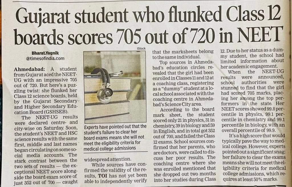 One notable case that drew attention involved a Gujarat student who flunked Class 12 boards but managed to score an astonishing 705 out of 720 in the NEET exam, raising suspicions about the legitimacy of such results and the potential use of unethical practices to achieve them .